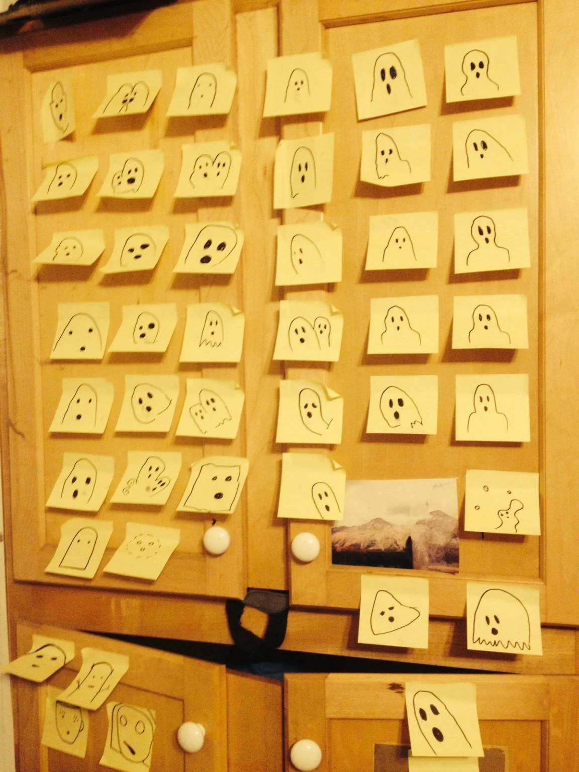 The number of ghosts varies depending on a space's dimensions. The largest amount of post-its a space has required was this past year, at roughly 5,400 ghosts. I try to do at least 1,500 to 2,000 new ghosts every year. In 2020, at The Green Gallery, I did 3,500 new ghosts. Certain motifs always return. Ghosts from previous years will pop up, or seem to lend themselves, and I'll reuse batches sometimes, sprinkle them in. But I take a smidge of pride that a little more than half the ghosts are always fresh ghosts. Every year. That's a guarantee.